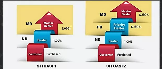 Maksudnya adalah untuk setiap posisi dealer yang kosong, incentive akan otomatis diberikan pada dealer yang berada di atasnya dari setiap transaksi customer. Dengan cara ini semakin tinggi level dealer, semakin besar pula peluang incentive akan diterima dari transaksi customer yang belum menjadi seorang dealer.