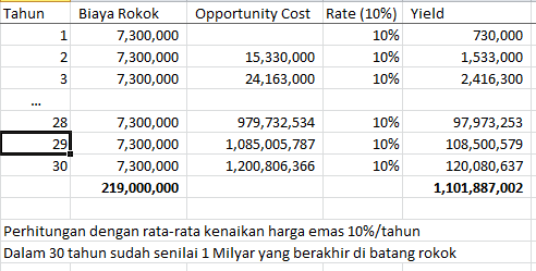 Dapat kita hitung kemudian jika Si perokok merokok selama 20 tahun maka jumlah yang dia bakar begitu saja adalah Rp. 146.000.000,- belum termasuk jika uang ini dibelikan emas sebagai investasi maka jumlah yang dia bakar bisa 300-400 juta.